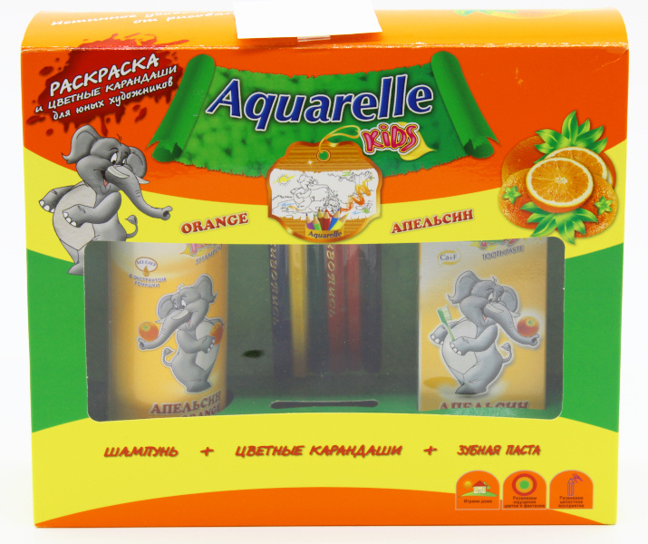 Подарочный набор для детей AQUARELLE KIDS апельсин (зубная паста, шампунь, цветные карандаши)