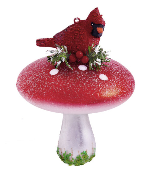Елочная игрушка Птица красный кардинал на грибочке, стекло, 9х9х13 см, стеклянная подвеска на елку 741 226399 (отдел елочная игрушка, подвеска на елку)