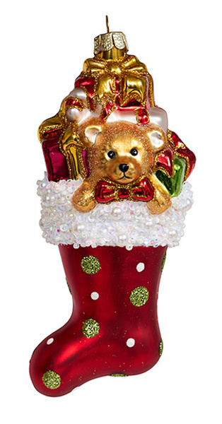 Елочная игрушка Носок рождественский «Медвежонок с игрушками», стекло, 6,5х6,5х12,5 см, стеклянная подвеска на елку 1068 250912 (отдел елочная игрушка, подвеска на елку)
