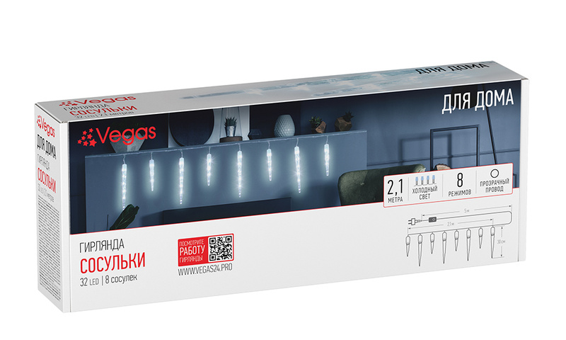 Электрогирлянда «Сосульки» 32 холодныхх LED ламп 8 сосулек прозр провод 2*0,3м 220v 55131