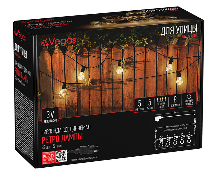 Электрогирлянда «Ретро лампы» 25 теплых LED ламп 8 режимов черный провод 55142