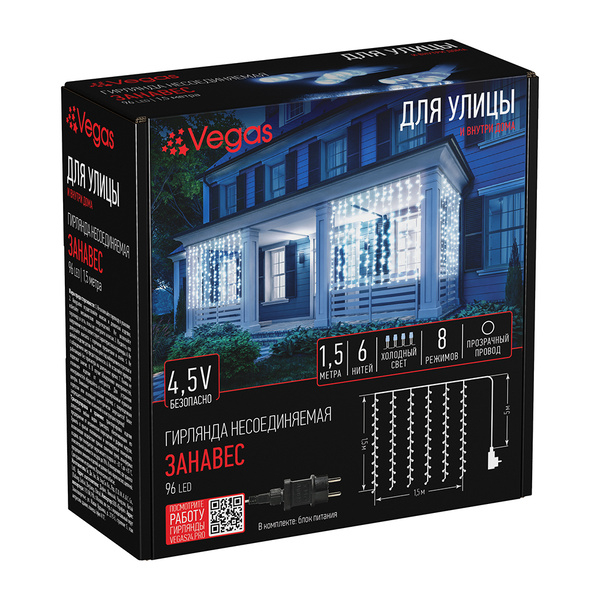 Электрогирлянда «Занавес» 1,5*1,5 м, 96 холодных LED ламп, 6 нитей, контроллер 8 режимов, прозрачный провод, с блоком питания, 55149