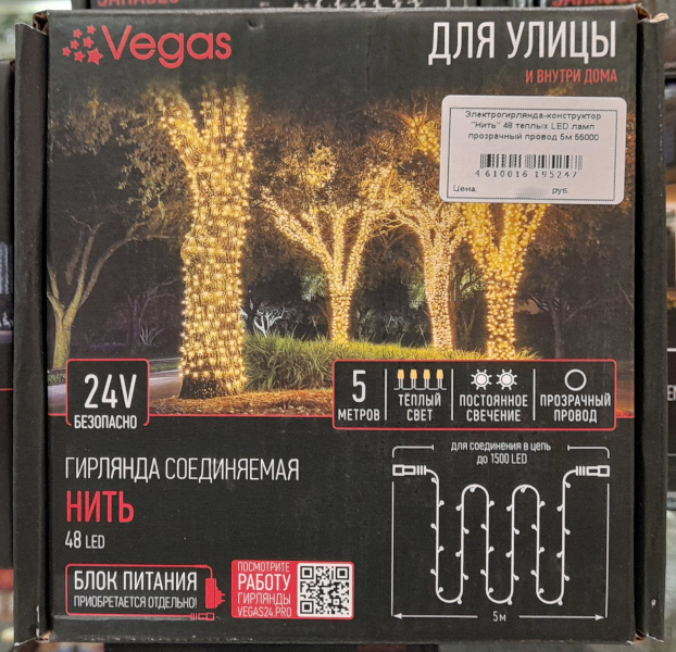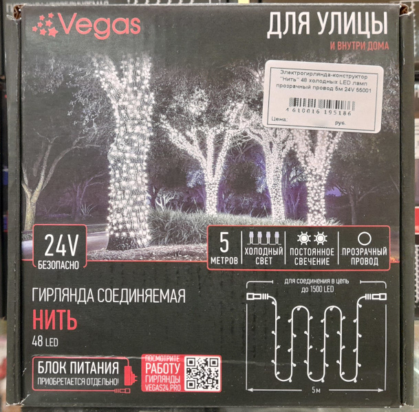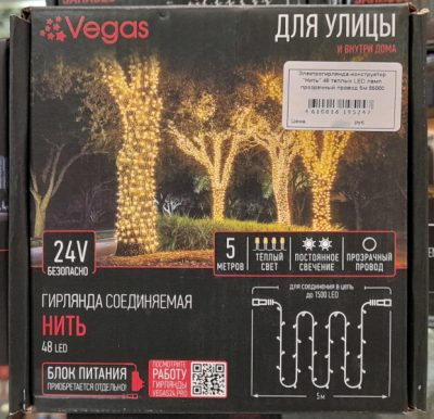 Электрогирлянда конструктор «Нить» 5 м, 48 холодных LED ламп, прозрачный провод, 24V, блок питания приобретается отдельно, 55001
