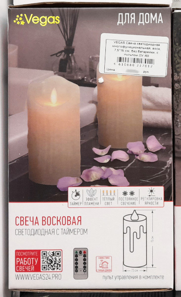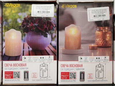Свеча светодиодная VEGAS, на батарейках, восковая, 7,5*8,5 см, без батарейки в комплекте, с пультом ДУ, с таймером