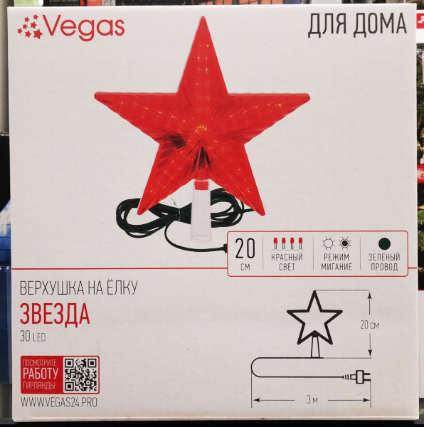 Верхушка на елку «Звезда» красная (кремлевская) 30 красных мигающих LED ламп, тёмно-зеленый провод 3м, 20*20 см, 220 вольт, 55086