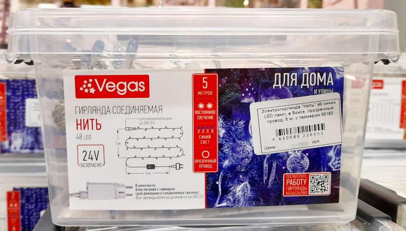 Электрогирлянда «Нить» для дома и улицы, 5 м, с блоком питания, 48 синих LED ламп, в боксе, прозрачный провод, с таймером, соединяемая, 55193