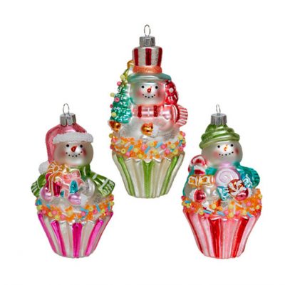 740 Капкейк «Снеговичок» карамельно-розовый, асс. из 3-х (стекло) 6,5х6,5х12см (отдел елочная игрушка, подвеска на елку)