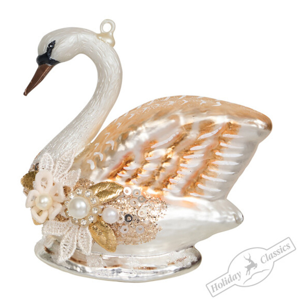 193035 Лебедь «Жемчужная бутоньерка» (стекло) 9х4х10см 930358 (отдел елочная игрушка, подвеска на елку)