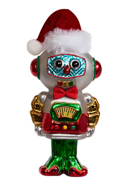 1048 Робот в рождественском колпачке (стекло) 6,5х4,5х15,5см (отдел елочная игрушка, подвеска на елку)