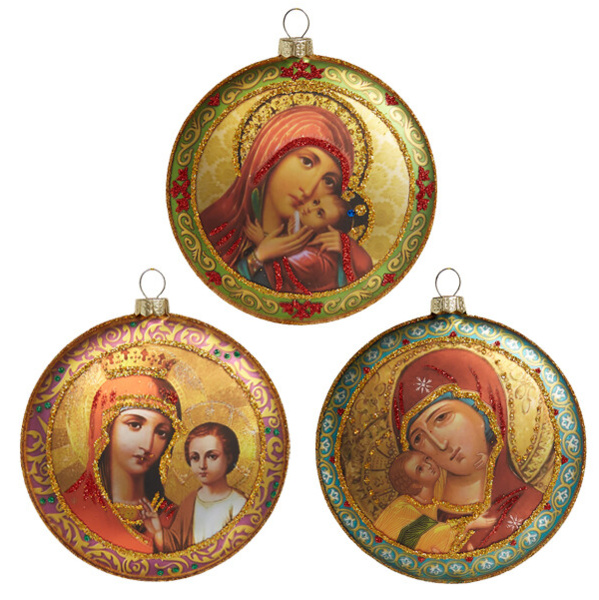 Ёлочная подвеска на ёлку медальон «Образ Божией Матери — Пресвятая Богородица Мария» двусторонний, в ассортименте из трёх (стекло) 10 см, украшение из стекла в подарочной коробке 5053-6-7 505358 (отдел елочная игрушка, подвеска на елку)