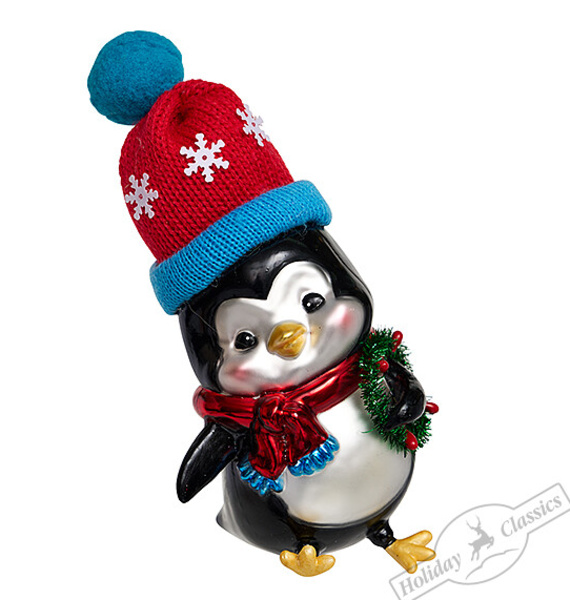 243218 Пингвин в красной шапке (стекло) 7,5х6,5х15,5см (отдел елочная игрушка, подвеска на елку)