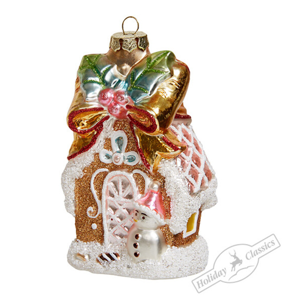 233074 Домик пряничный с рождественским бантом (стекло) 7,5х5х12,5см 330745 (отдел елочная игрушка, подвеска на елку)