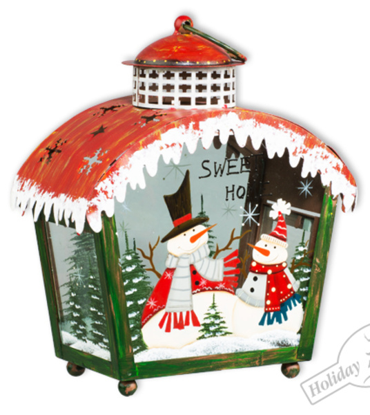 68298 Фонарь рождественский с красной покатой крышей со снежинками (металл/стекло) 18,5х10,2х21,5см (отдел елочная игрушка, подвеска на елку)