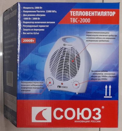 Тепловентилятор 2000 Вт, СОЮЗ ТВС-2000, 3 режима, регулировка, термостат, защита от перегрева, ручка для переноски