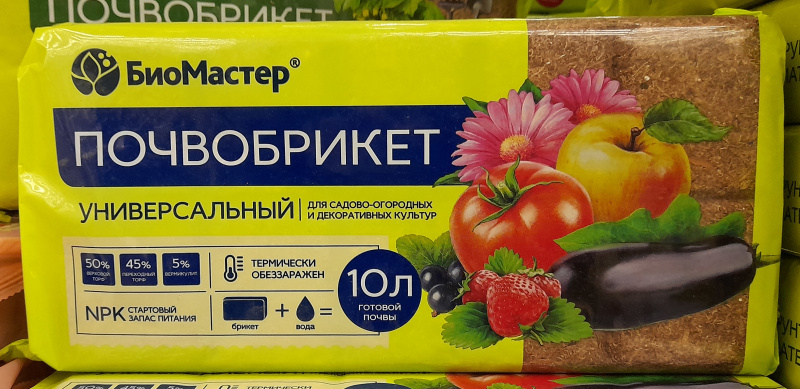 Почвобрикет 10л БиоМастер, Универсальный, с гидрогелем, для садово-огородных и декоративных культур (отдел земля, грунт, почвогрунт, удобрение)