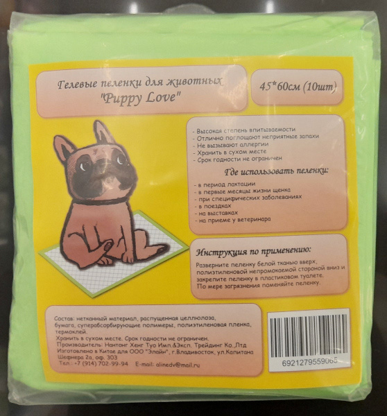 Пеленки гелевые для животных, собак Puppy Love 45*60 см, 10 шт.