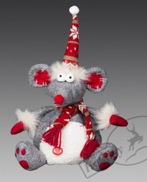 Количество товара 111 Мышь-хохотушка анимационная красно-серая в красном рождественском колпаке, 26-34см (отдел елочная игрушка, подвеска на елку)