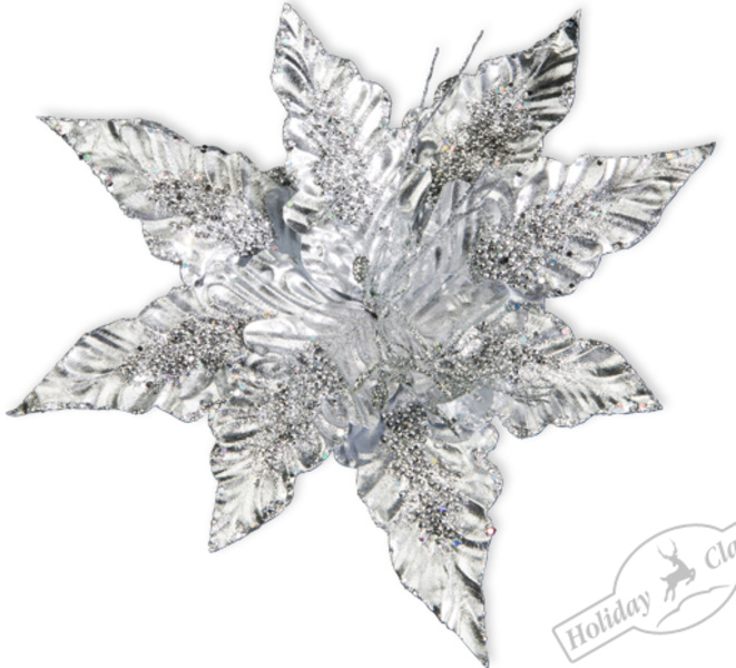 117 Пуансеттия серебряная бархатная с бисером d 32х15см 154913 (отдел елочная игрушка, подвеска на елку)