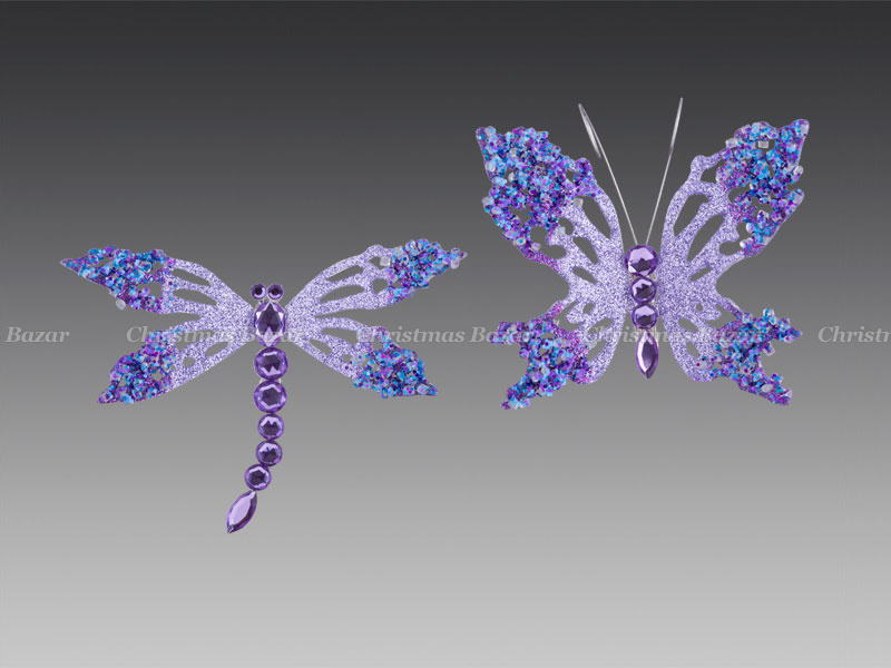 12138LB Бабочка/Стрекоза «Мале» лавандовая со стразами, на прищепке, асс. из 2-х, 10,5х8,5см (отдел елочная игрушка, подвеска на елку)