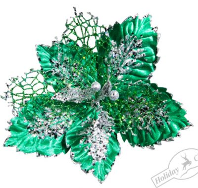 118 Пуансеттия изумрудная бархатная с ажурными лепестками и серебряными пайетками d 32х15см 154920 (отдел елочная игрушка, подвеска на елку)