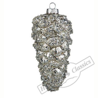 1298 Шишка сосновая с бисером серебряная винтаж 6х12,5см стекло (отдел елочная игрушка, подвеска на елку)