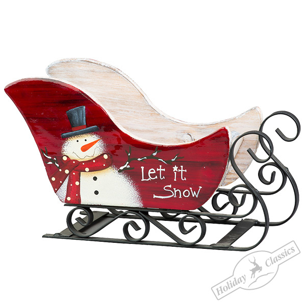 1567 Сани с рождественским рисунком красные (дерево/металл) 22х10х13см (отдел елочная игрушка, подвеска на елку)