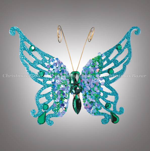 16121T Бабочка «Фиджи» бирюзовая искристая с изумрудными стразами на прищепке, 13,5х9,5см (отдел елочная игрушка, подвеска на елку)