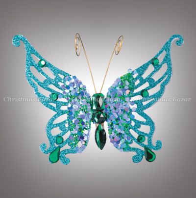 16121T Бабочка "Фиджи" бирюзовая искристая с изумрудными стразами на прищепке, 13,5х9,5см (отдел елочная игрушка, подвеска на елку)