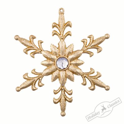 1603 Снежинка "Королевская лилия" золотая искристая со стразом в центре, 11х12,5см (отдел елочная игрушка, подвеска на елку)