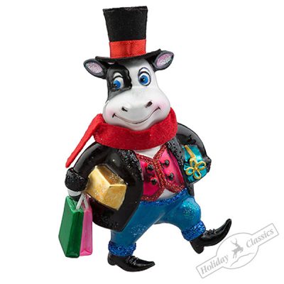 204913 Бычок "Рождественский шоппинг" (стекло) 8х4,5х12,5 см (отдел елочная игрушка, подвеска на елку)