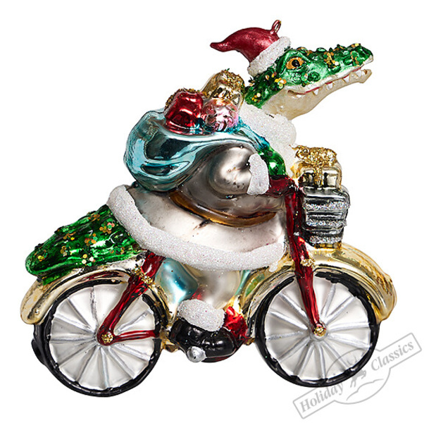 643 Крокодил с подарками на велосипеде (стекло) 10х4х10,5см (отдел елочная игрушка, подвеска на елку)
