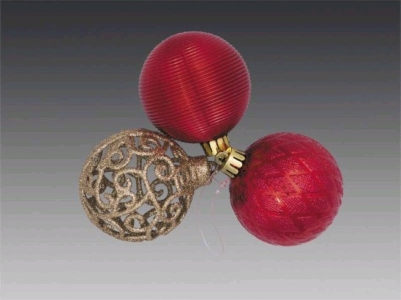 Гроздь из 3-х фигурных шаров: золотой искристый филигранный/2 красных, 6 см PL173631